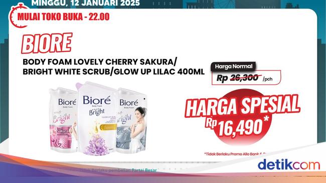 Tambahan Diskon 20% bisa didapatkan saat melakukan pembayaran menggunakan Allo Prime, kartu kredit Bank Mega, atau Bank Mega Syariah. Untuk hari ini, harga Biore Body Wash 400 ml cairan sabun biasanya Rp 26.300/pouch, sementara harga spesialnya Rp 16.490/pouch.