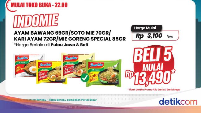 Khusus hari ini, pelanggan bisa mendapatkan harga spesial setiap pembelian 5 bungkus Indomie varian mie goreng spesial, ayam bawang, soto mie, kari ayam, dan mie goreng seharga Rp 13.490. Padahal harga per bungkus mie instan Rp 3.100.